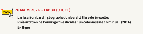 Larissa Mies Bombardi, chercheuse et spécialiste des pesticides au Brésil, vit désormais en Europe où elle a dû s’exiler. Elle était en mars/avril en tournée dans plusieurs villes (Toulouse, Bruxelles, Lille, Rennes, Paris, Liège…) ! Les photos sont à retrouver sur nos réseaux sociaux.