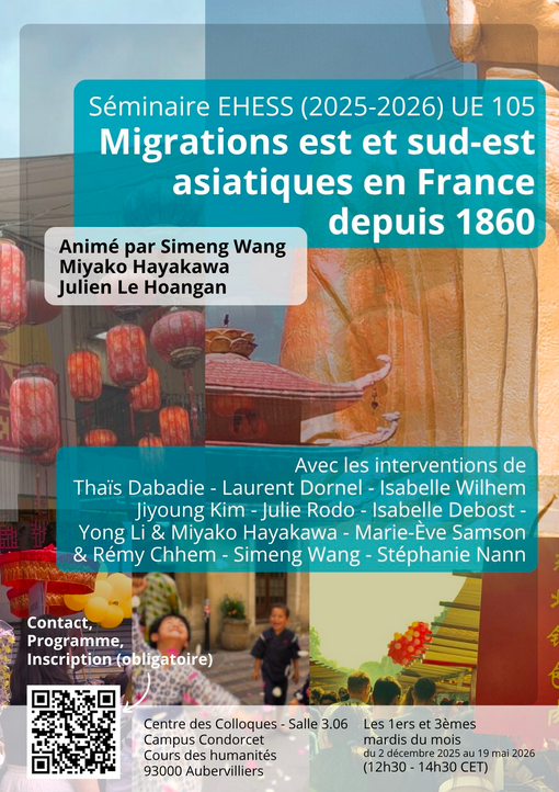 Deuxième année du séminaire organisé par le réseau « Migrations asiatiques en France », co-animé par Simeng Wang, Miyako Hayakawa et Julien Le Hoangan. En puisant dans les méthodes diverses des sciences sociales, ce séminaire vise avant tout à introduire les étudiant·es aux histoires, connaissances clefs et travaux incontournables dans les études de migrations de l’Asie de l’Est et du Sud-Est en France. En mobilisant les recherches historiques et les enquêtes empiriques récemment menées sur le sol français, ce séminaire se propose de mettre en valeur plus d’un siècle de migrations asiatiques en France, jusqu’ici relativement peu racontées, dans une perspective comparative.